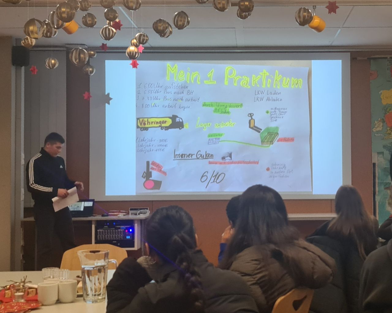 Höhepunkt des Abends waren die Präsentationen der Schüler*innen der Klasse AV1a zu ihren Erfahrungen aus dem Praktikum und die Erfahrungsberichte ehemaliger Schüler*innen über ihren Einstieg in die Ausbildung. Dabei waren sich alle einig, dass ein Praktikum der beste Einstieg in eine Ausbildung ist.