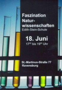 Am 18. Juni läd die Edith-Stein-Schule Ravensburg von 17.00 bis 19.00 Uhr alle herzlich ein, die sich für Life Sciences und Naturwissenschaften interessieren. Vom Bereich der Biotechnologie, über die Ernährungslehre, bis hin zu biologischen und chemischen Vorgängen, bieten die Schüler der Oberstufe ein weites Spektrum an Versuchen zum Mitmachen und Staunen an. Für musikalische Untermalung und das leibliche Wohl ist selbstverständlich gesorgt.