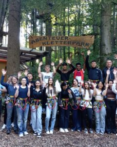 Einen außergewöhnlichen Schultag mit dieser interessanten Kombination durften 18 Schülerinnen und Schüler der AV1a im Kletterpark Tannenbühl erleben. Um sich besser kennenzulernen und die Klassengemeinschaft zu stärken organisierten Frau Nagel, Frau Elbs und Herr Eisele dieses Abenteuer in bis zu 20 Metern Höhe. Fast alle konnten ihre Angst besiegen und Parcours der höchsten Schwierigkeitsgrade bewältigen. Das wunderbare Wetter, die hohen Bäume. Seilbahnen, Netze zum Klettern sowie die Mischung aus Geschicklichkeit, Nervenkitzel und Erfolgserlebnissen verwandelten den Ausflug in einen unvergesslichen, besonderen Tag.